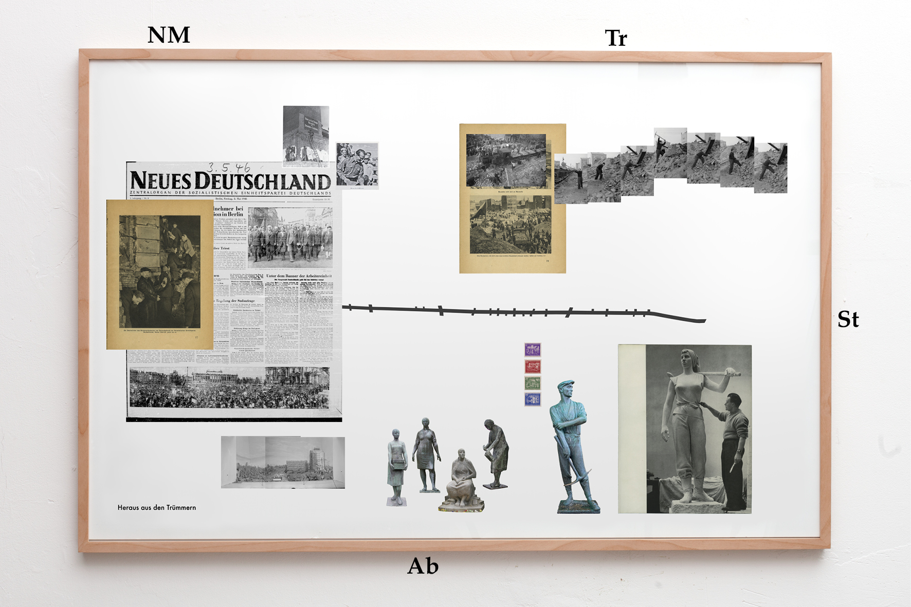 “Heraus aus den Trümmern” uses propaganda images, which promoted the clearing of rubble as a collective mission and individual duty. “Die eerste sozialistische Straße der Hauptstadt Deutschlands Berlin” revolves around the construction of the Stalinallee, which was the first prominent city planning project in East Berlin. “Aufmarschwege” shows the parade routes for the mass demonstrations of the working classes that were held between 1946 and 1974. “Erhebende Gesten” collects the statues that were installed in East Berlin between 1952 and 1985. In their poses and gestures, the statues show the pathos of the socialist utopia of the New Man.