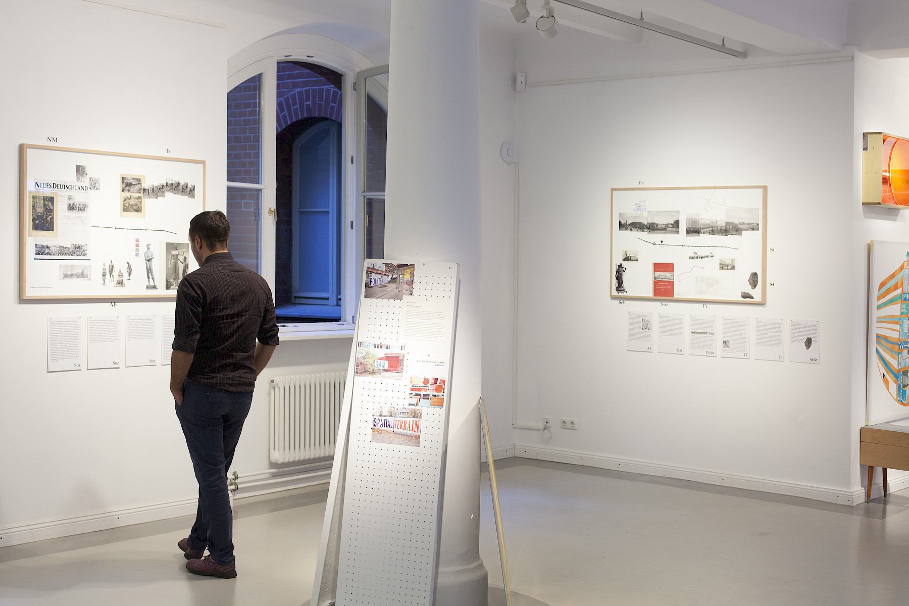 “Heraus aus den Trümmern” verwendet Propagandabilder die die Trümmerräumung als gemeinschaftliche Aufgabe und individuelle Pflicht anpreisen. “Die eerste soizalistische Straße der Hauptstadt Deutschlands Berlin” thematisiert den Bau der Stalinallee als erstes städtebauliches Vorzeigeprojekt Ost-Berlins. “Aufmarschwege” zeigt die Marschpläne für die Massendemonstrationen die von 1946 bis 1974 in Ost-Berlin geplant und ausgeführt wurden. “Erhebende Gesten” zeigt die Statuen die im öffentlichen Raum in zentral-nördlichen Teil Ost-Berlin’s zwischen 1952 und 1985 aufgestellt wurden. In den Posen und Gesten der Bilder wird der Pathos der sozialistischen Utopie des neuen Menschen sichtbar.